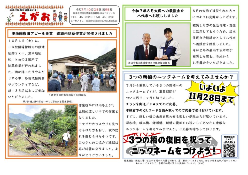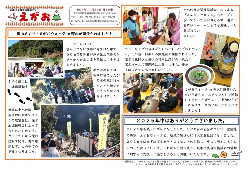 坂本住民自治協議会では、毎月末に「坂本住民自治協議会だより えがお」を発行しています。